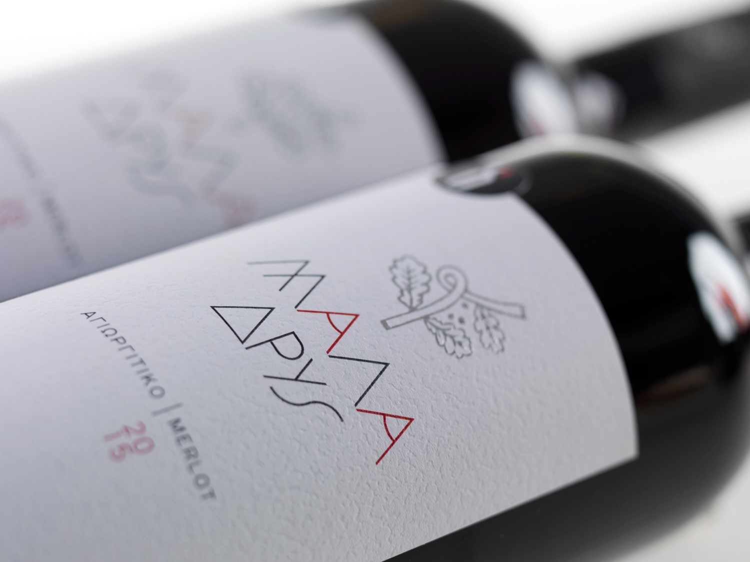 wine label design for a Peloponnese family winery, named after the oak trees in abundance in the area
